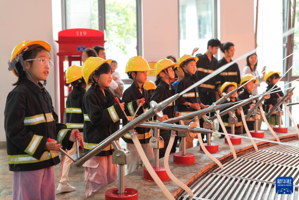 6月2日,小朋友在杭教學州青少年活動中心“Do都城”體驗“消防員”滅火救援。